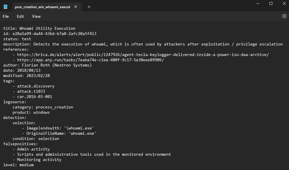We can see from the Sigma rule that the ‘whoami’ command was detected because the ‘whoami.exe’ process was created. Attackers know this type of behavior is heavily monitored so they generally avoid running a post-exploitation command that would result in the execution of ‘whoami.exe’.