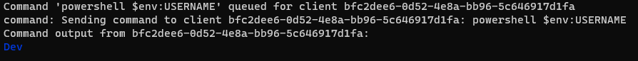 First, we should execute a command from the C2 server which executes a command on the victim system that will surely trigger an alert from Aurora. Let’s run a command that will execute ‘whoami’. Below shows the command execution of ‘whoami’ as well as the output of the command shown on the C2 server console.