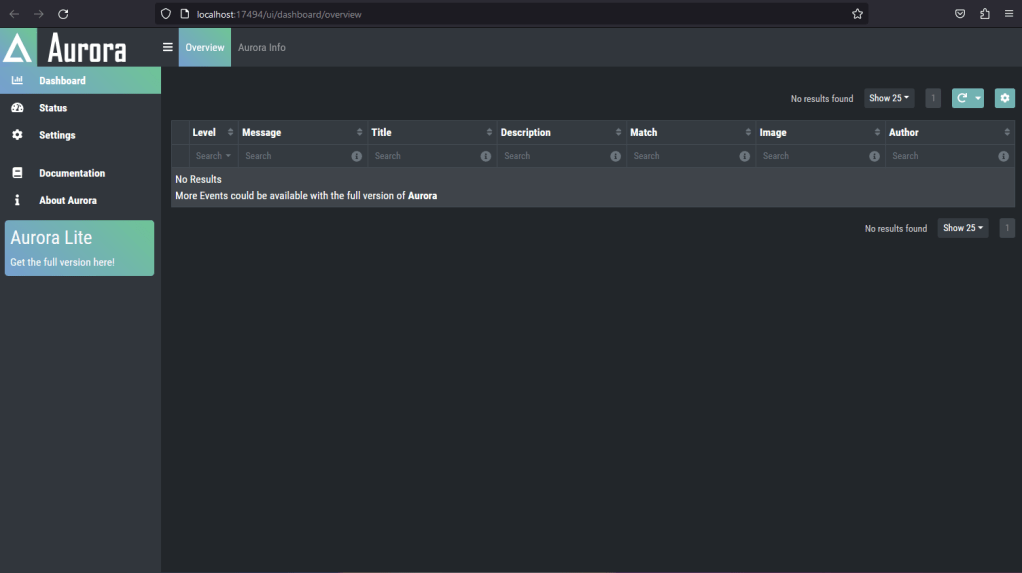 As you can see from the screenshots above, the malware is communicating back to the C2 server allowing for remote command execution. Next, let’s see if Aurora is detecting the initial execution of the malware. Aurora Lite runs locally on the machine and serves a web based dashboard on port 17494. We navigate to the web portal on the victim to view the alert dashboard.